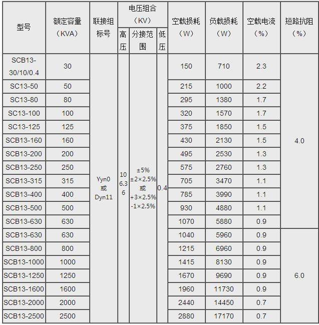 SCB13干式变压器技术参数: